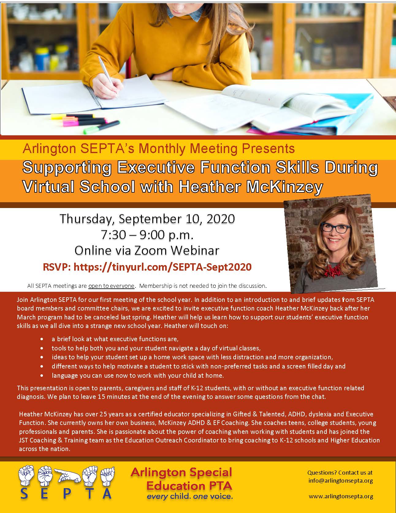 - Presentation by ADHD and Executive Function Coach Heather McKinzey: Supporting Executive Function Skills During Virtual School (45 minutes) Questions taken from Chat (15 min)