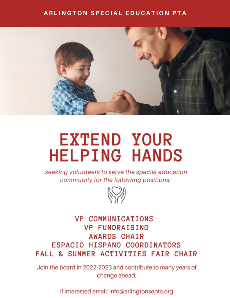 We invite YOU to join the Arlington SEPTA leadership team for the 2022-23 school year and make a positive impact on the APS community next year. Join a team of dedicated, supportive and creative leaders in building a community and providing a voice for families and students with disabilities across Arlington.