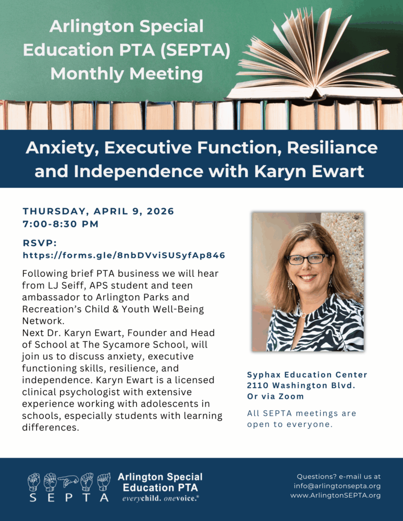 Following brief PTA business we will hear from LJ Seiff, APS student and teen ambassador to Arlington Parks and Recreation’s Child & Youth Well-Being Network.