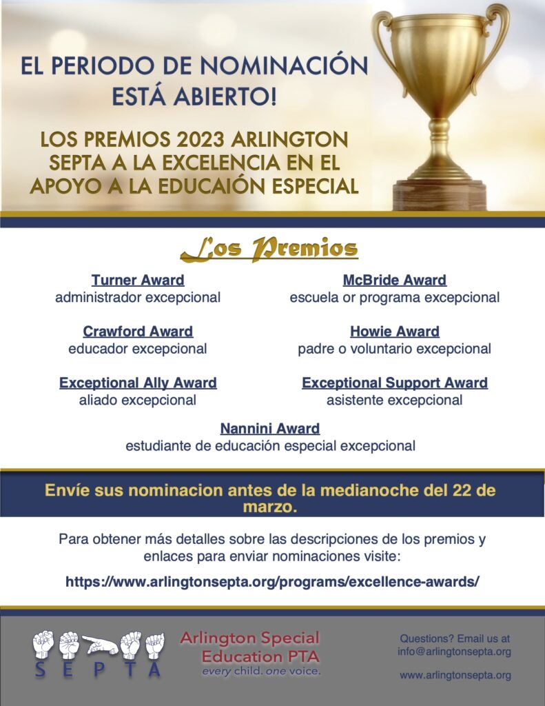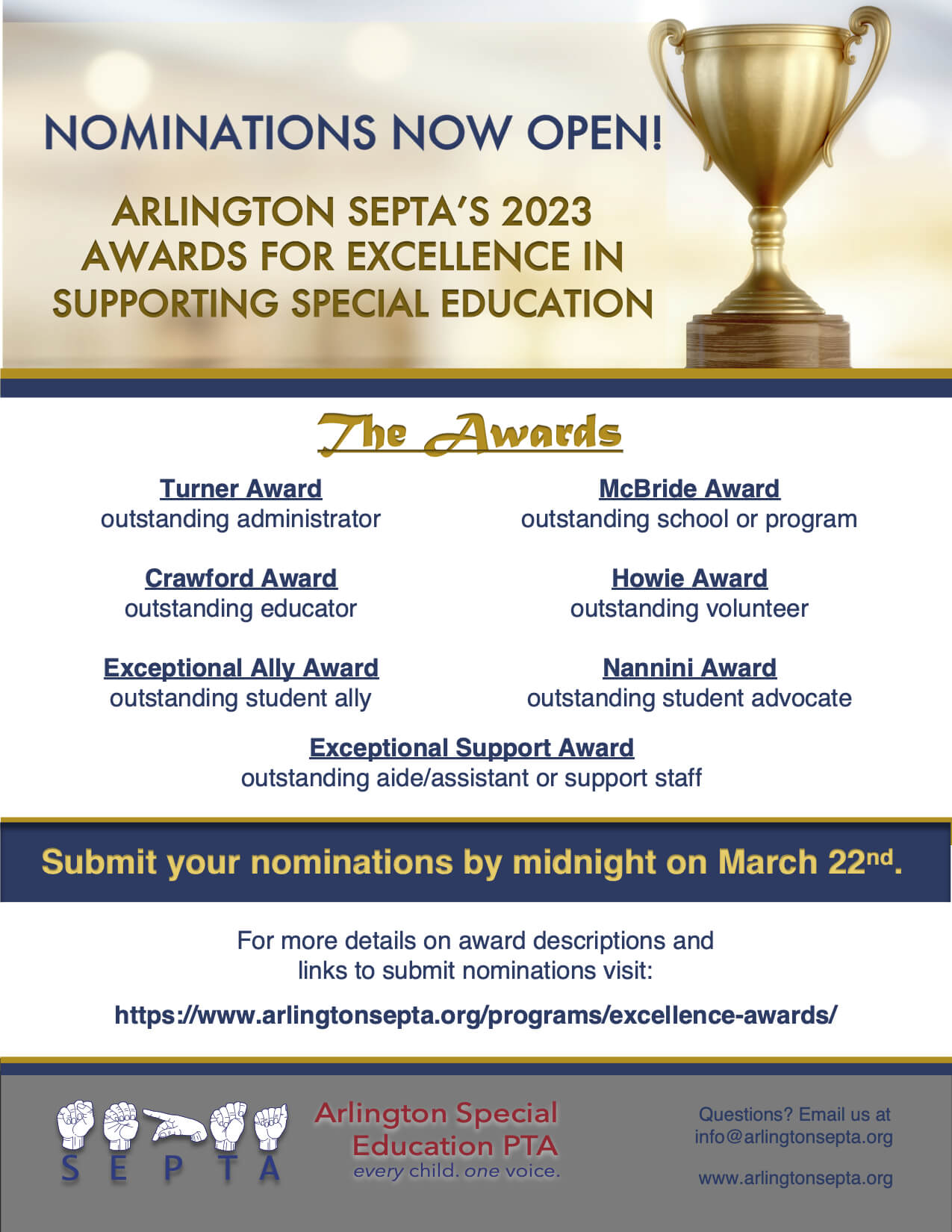 Our children’s futures are full of possibility because APS is filled with talented teachers, educators and leaders. SEPTA accepts nominations each year for the annual Recognition for Excellence in Special Education- held on May 17th this year. Acknowledge someone by submitting your nomination. The deadline for nominations is March 22nd.