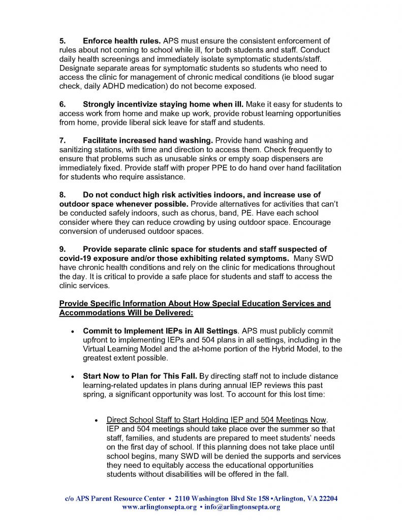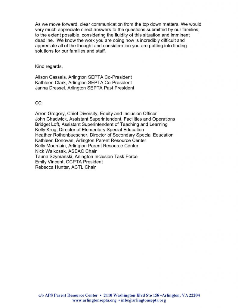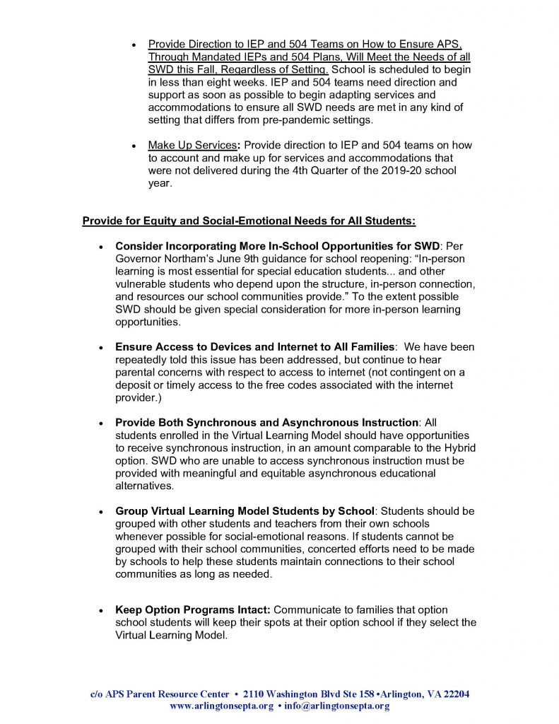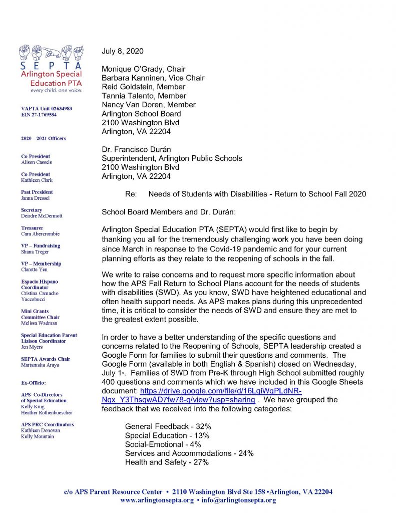 Thank you for the tremendous response to the Google Form sent on July 1st regarding the APS return to school plans. We took all of the feedback you provided and organized it into this Google Sheets document: https://drive.google.com/file/d/16LgiWgPLdNR-Nqx_Y3ThsqwAD7fw78-q/view?usp=sharing . Along with this document we have sent the letter below written by Co-Presidents, Alison Cassels and Kathleen Clark, and Past President, Janna Dressel, to Dr. Durán and the School Board. We hope to receive feedback to the many great questions and insights you provided and will plan to share any responses that we receive.