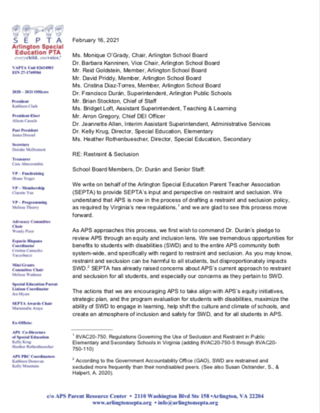 On February 16, 2021 we sent the following letter to the School Board, Dr. Duran and senior staff regarding APS’ development of a Restraint and Seclusion Policy. Thank you to our Advocacy Committee for the hard work, research, and great insights they provided to develop these recommendations for APS to consider in its work.