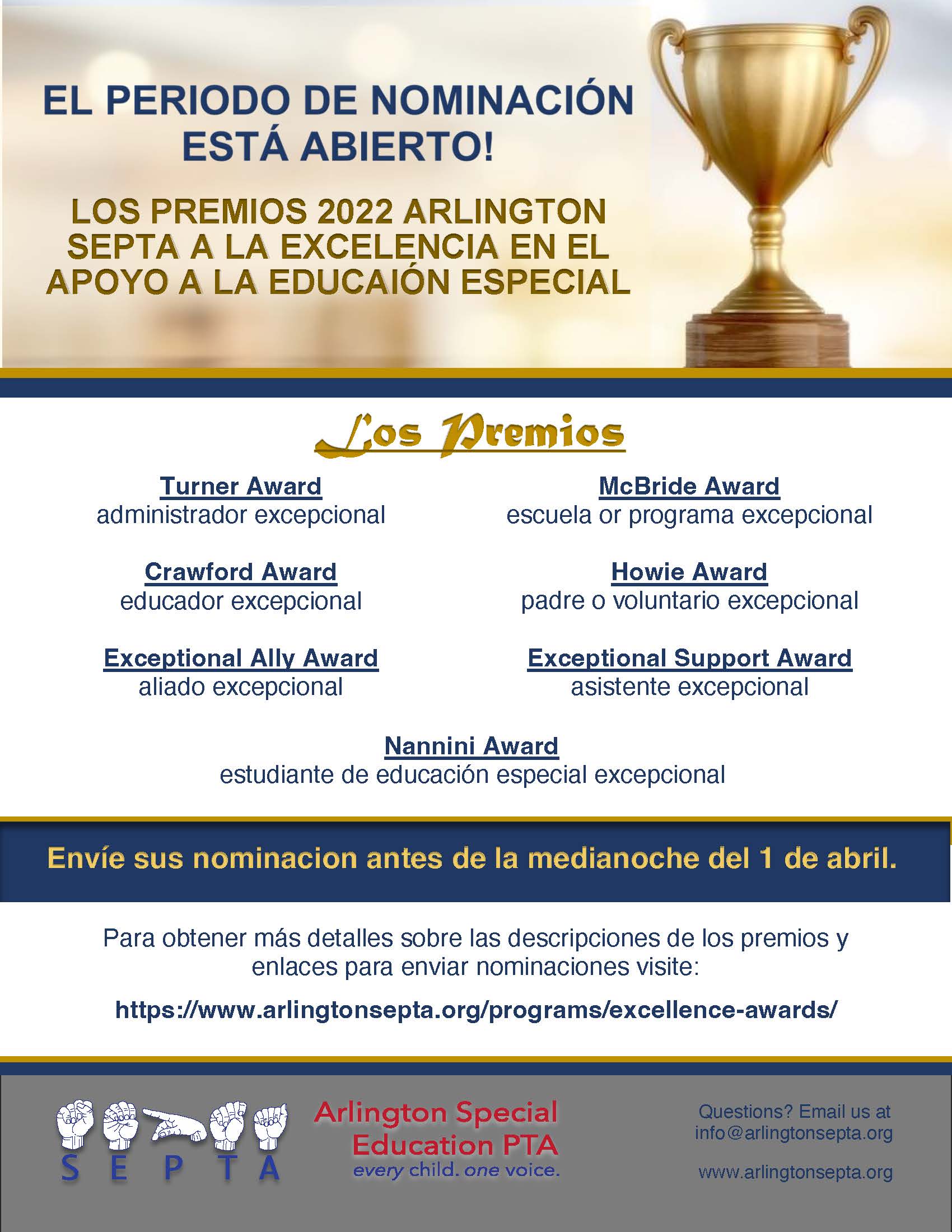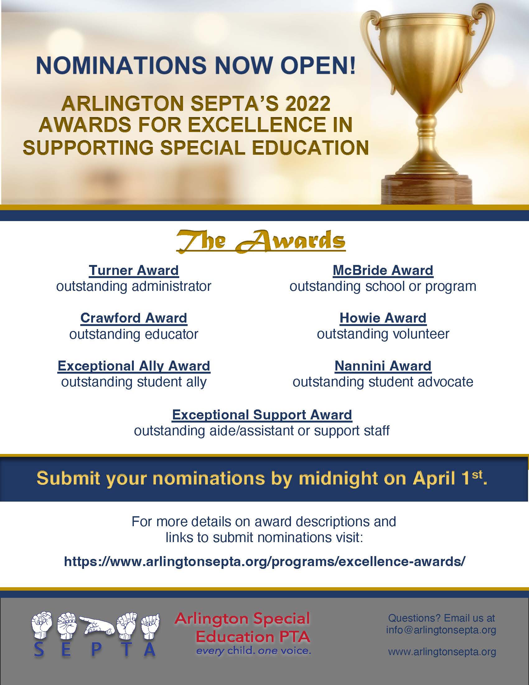 Arlington Special Education PTA (SEPTA) welcomes nominations in recognition of Excellence in Supporting Special Education.