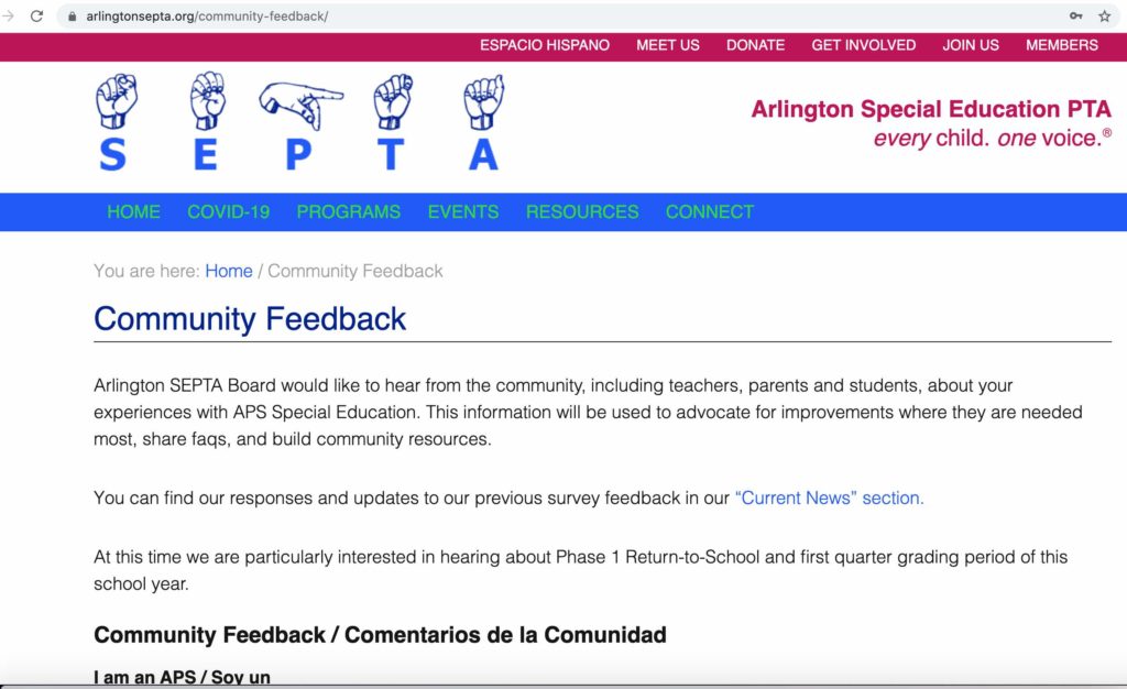 We have created a new page on SEPTA’s website to gather not only Phase 1 feedback, but also any feedback related to distance learning or Arlington special education in general. https://www.arlingtonsepta.org/community-feedback/ The information we gather will help us advocate for our students and teachers more effectively and understand the needs of our large and diverse community of families, educators and students. As you will see, the form is simple so you can provide as much or little information as you would like.