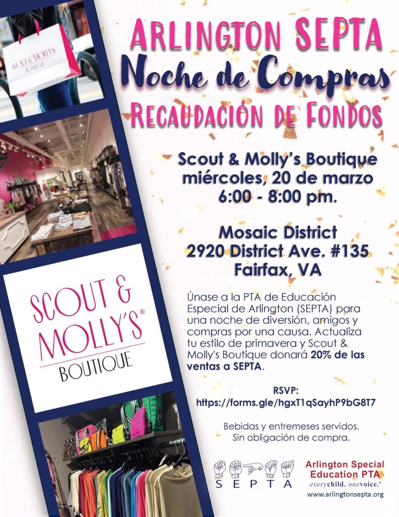 Únase a la PTA de Educación Especial de Arlington (SEPTA) para una noche de diversión, amigos y compras por una causa. Actualiza tu estilo de primavera y Scout & Molly’s Boutique donará 20% de las ventas a SEPTA.