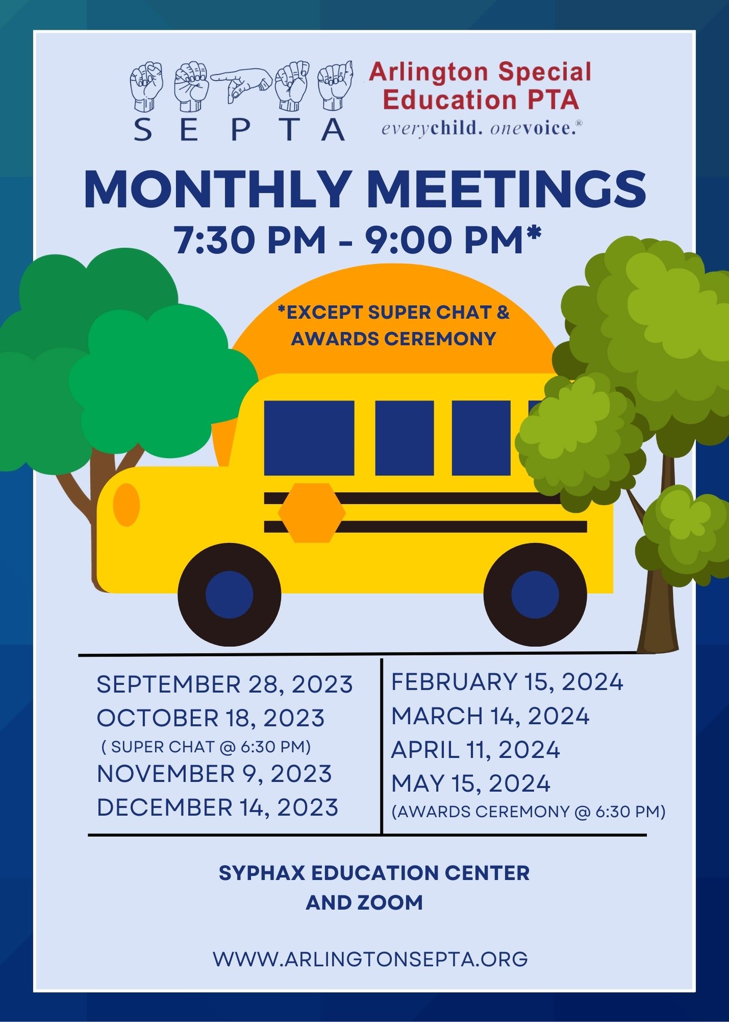 We hope your student’s first few days of school were excellent. Thank you to all the educators, administrators, and APS staff- sending vibes and energy as you continue to work both behind the scenes and on the scenes. Here is the 2023-24 monthly SEPTA meeting calendar for your convenience. The annual Summer Resources Fair is tentatively slated for February 2024 and will be announced once it is finalized. You can always check back on the https://www.arlingtonsepta.org/calendar/
