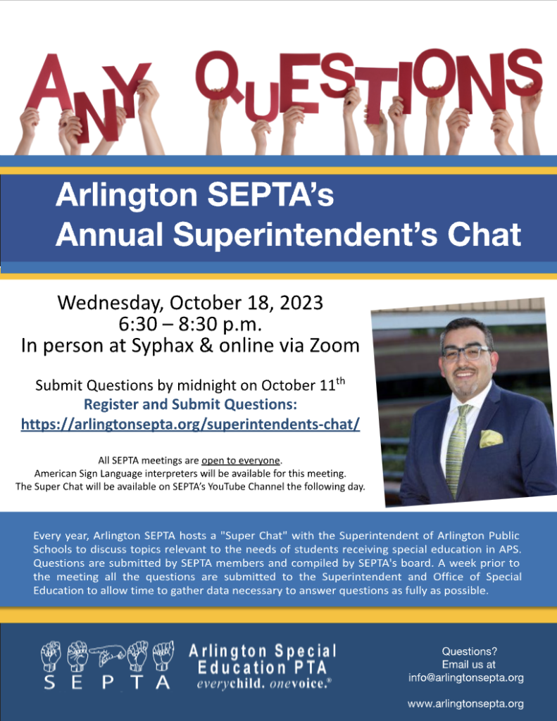 Each year, Arlington SEPTA hosts a “Super Chat” with the current APS Superintendent and Office of Special Education team to discuss topics relevant to the needs of students receiving special education in APS. Questions are submitted by SEPTA members, compiled by SEPTA’s board and submitted to the Superintendent and Office of Special Education approximately a week in advance to allow time to gather data necessary to answer questions as fully as possible.