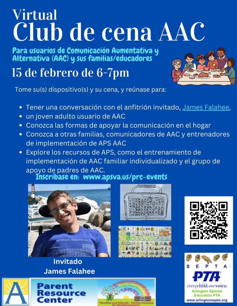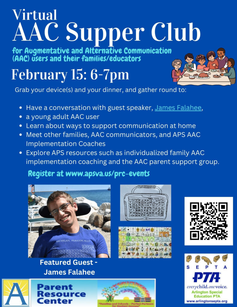 Students who utilize Augmentative and Alternative Communication (AAC) devices/systems and their families and educators are invited to join the Arlington SEPTA, APS AAC Implementation Coaches and the Parent Reosurce Center for our first Virtual AAC Supper Club, featuring guest speaker, James Falahee, a young adult AAC user.